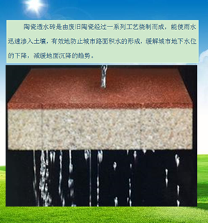 陶瓷透水磚是磚體透水,吸水,快速透水功能,可以防止地下水枯竭,減輕下水道的負擔。防止城市內澇,降低周邊環境溫度,改變熱島效應。另外,由于強大的透水功能,即使下雨走路也不濕鞋,不濺起。